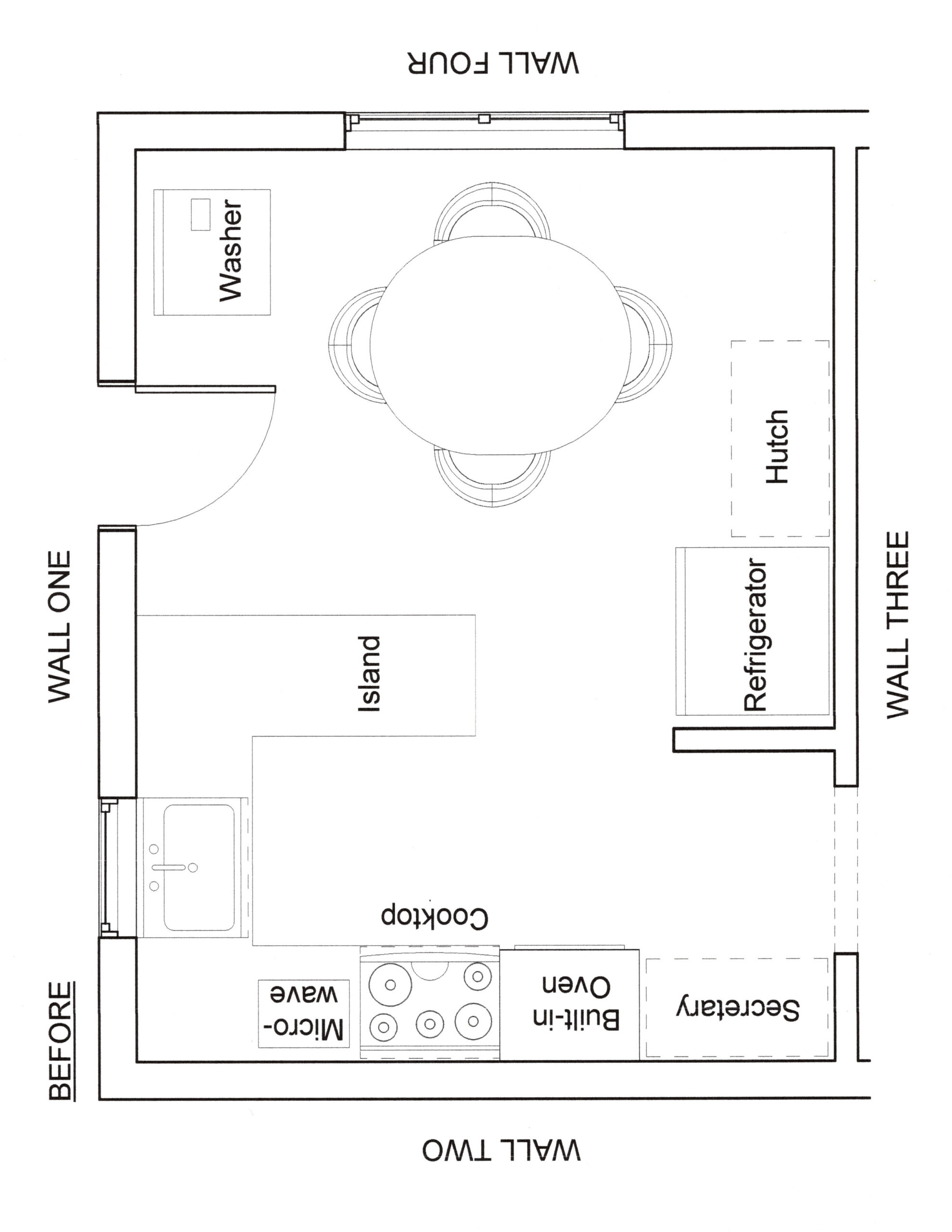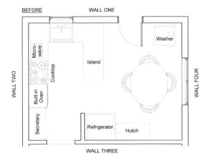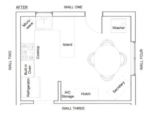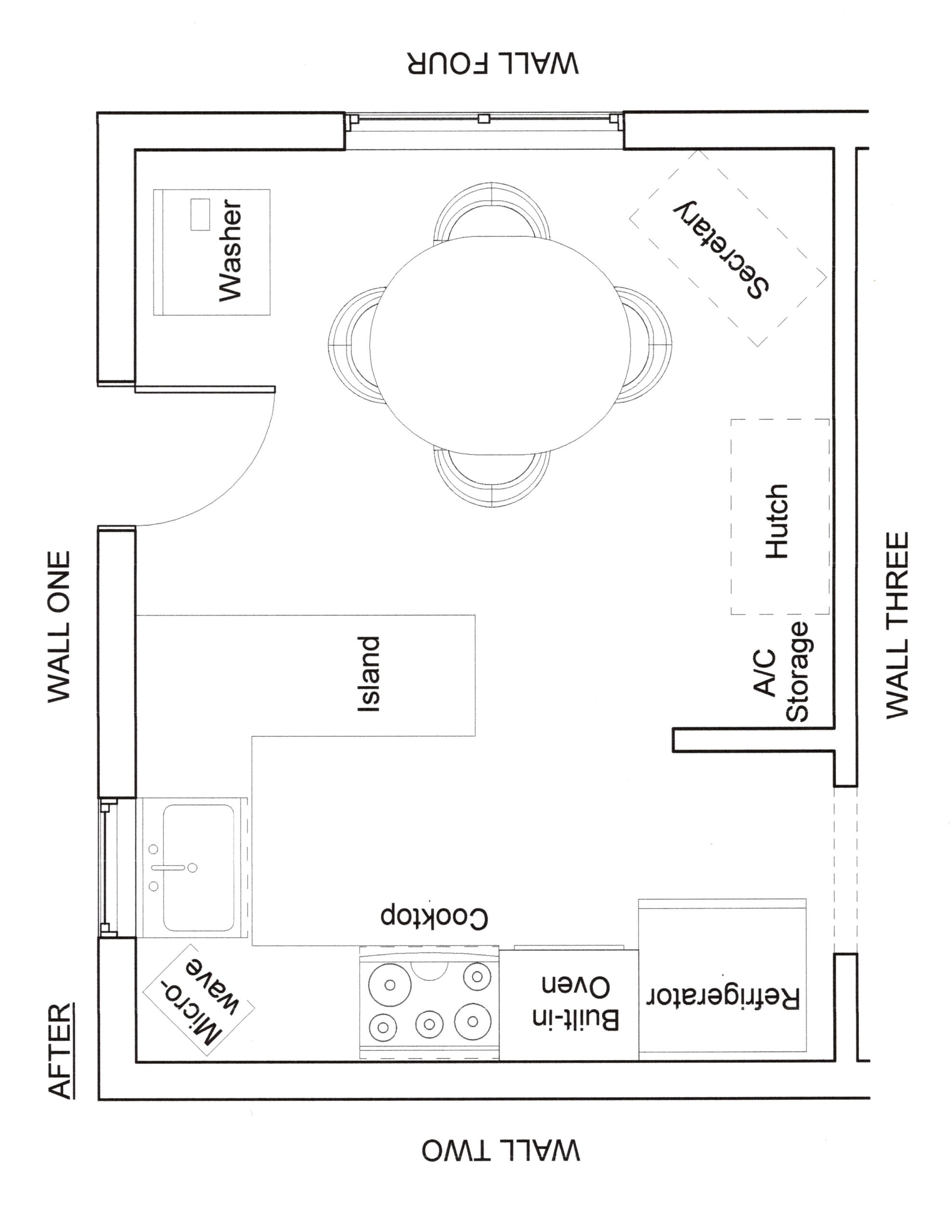 It turns out that MC’s kitchen was perfect for my 3D interpretation of the Old Professor’s theorem. Wall Two with the stove was dominant, Walls Three and Four were subdominant and Wall Four with the window and dining table were virtually empty.